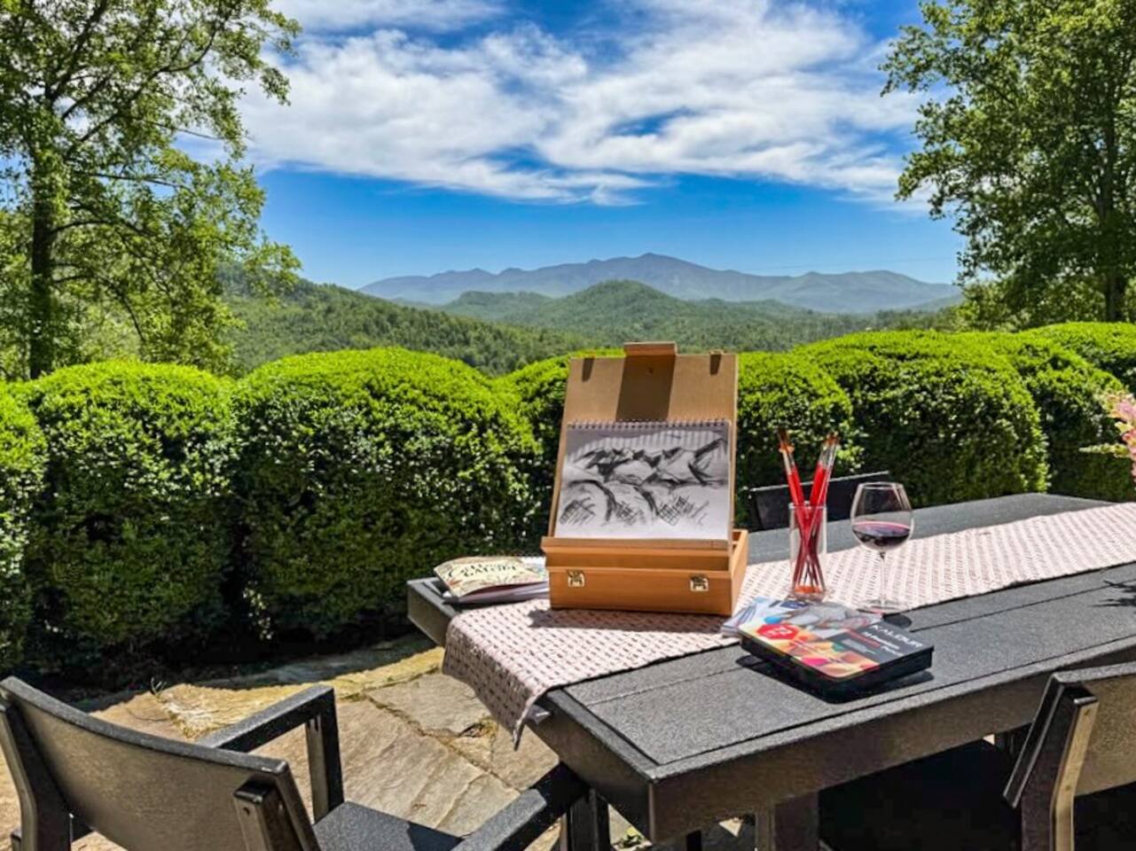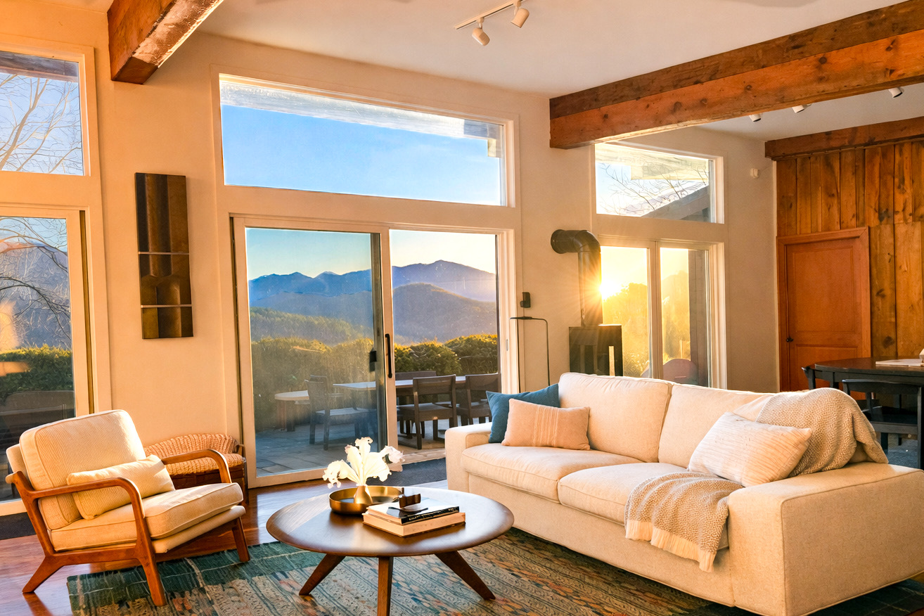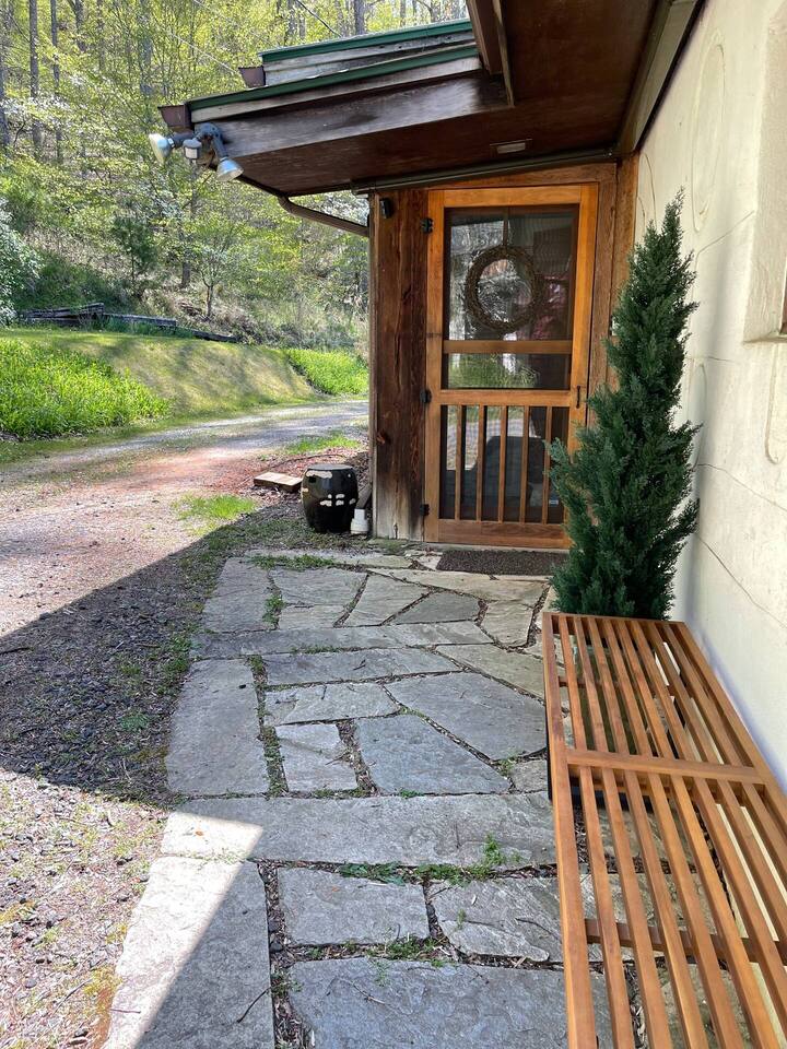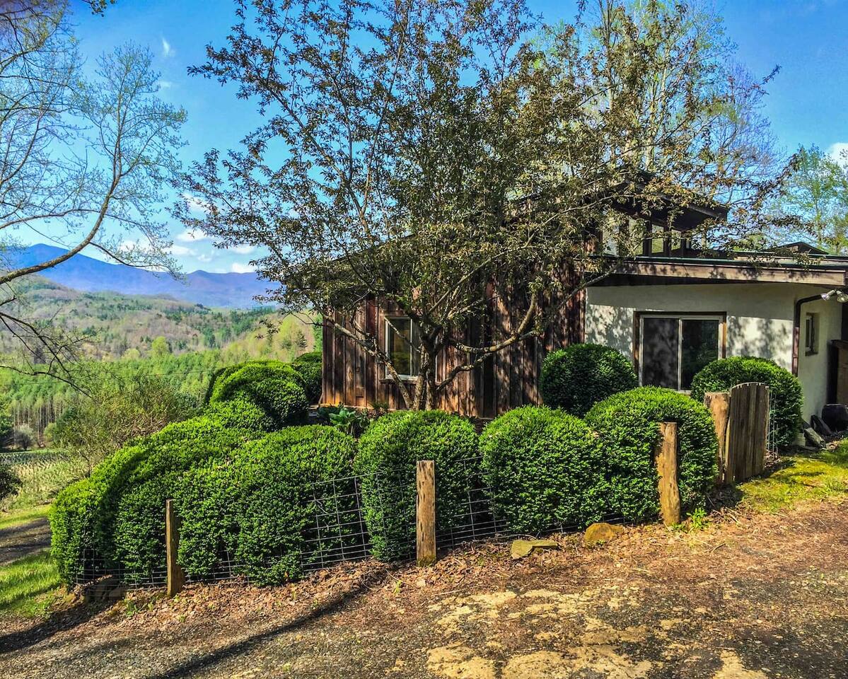Explore, Create, Relax Hike the trails, visit waterfalls, bake bread in the chef’s kitchen, paint the stunning view, photograph a mountain sunset, take a class at Penland, enjoy a writers’ retreat, soak in the jetted tub while watching a movie, or simply catch up on your reading—this modern glass house is perfect for all of it. (Some trails remain closed from Helene, but many are now open.) *💛 Please click the heart in the top right corner to add us to your wishlist! Doing this helps you find the home later and helps great guests like you find us too. We’ve loved hosting since 2015 and pride ourselves on an excellent stay. Read on for more reasons to visit this year. ⸻ AMENITIES Beds: 2 Kings (per primary), 1 Full Foldout (2nd Primary), 1 Queen (detached office) Total Living Space (with office): ~2,450 sq. ft. General • Safe, rural location 15 minutes from town • 6 private acres at 3,200–3,400 ft. elevation with panoramic mountain views • Fast fiber-optic internet & mesh Wi-Fi • Smart home with Alexa & keyless entry • Motion-sensing exterior cameras • Handmade details & commissioned artwork throughout • Easy access from state-maintained roads Family Friendly • Toddler tableware, Pack ’n Play with sheets • 1,150 sq. ft. terrace with fenced yard & hammock • HE washer/dryer with detergent ⸻ LIVING & DINING (~1,000 sq. ft.) • Indoor seating: bar/prep 7, dining 8 • Outdoor dining for 10 on 1,152 sq. ft. stone terrace • Half bath • 65” 4K HDTV, sound bar • Mini Nintendo & Xbox One S (account required) • Amazon Fire streaming with house accounts • Cable & live sports via Amazon TV ⸻ KITCHEN • Coffee & tea setup: French press, Mr. Coffee w/reusable filter, moka pot, pour-over, hot water dispenser, burr grinder, milk frother, and medium roast Fair-Trade beans and an assortment of teas • Gas range, convection oven, Sub-Zero fridge, stainless dishwasher, microwave • KitchenAid Pro mixer, Ninja blender & food processor • Cuisinart cookware & utensils • Handmade Fork Mountain pottery tableware • Pantry staples & cleaning supplies • 30+ sq. ft. of prep space—cook and socialize • Weber charcoal grill (charcoal not provided) • Seasonal apples, pears, blueberries, and fresh herbs on property ⸻ PRIMARY SUITE (~500 sq. ft.) • King bed, HDTV, chaise lounge reading nook, walk-in closet • Ensuite bath: jetted tub, separate shower, heated floors, custom fixtures • Hairdryer, toiletries, makeup mirror, plush towels • Independent heat & A/C SECOND PRIMARY (~500 sq. ft.) • King bed, queen foldout couch, HDTV, closet & dresser • Ensuite bath: tub/shower combo, makeup mirror, hairdryer, toiletries • Separate water heater & independent climate control DETACHED OFFICE/3rd BEDROOM is available upon request. As us for details. An additional $30 cleaning charge will apply. ⸻ ABOUT THE HOME Originally two cabins joined by artist and former Penland director Bill Brown Sr., the home now features two suites and an open, light-filled living area. Many original railings and details remain, including a Doug Sigler-designed kitchen. Its passive-solar design captures warmth and sunlight year-round, framing mountain views from every room. The home features commissioned artwork and handmade pieces that reflect the area’s craft heritage. ⸻ VISITING IN THE OFF-SEASON: Winter views are breathtaking! Trails and waterfalls are quiet and serene. Some businesses adjust hours mid-December through February, but others offer pop-ups, events, and winter menus. If you’d like help deciding whether the off-season fits your plans, just ask—we’re happy to help. ⸻ CHILDREN: Children are welcome! This is a home, not a museum, but we ask parents to be attentive—move delicate items or cords out of reach as needed for safety. ⸻ ✅ Have a larger group? Our sister property, Dougs Way, sleeps 10 and is just 4 minutes away. Ask for details!