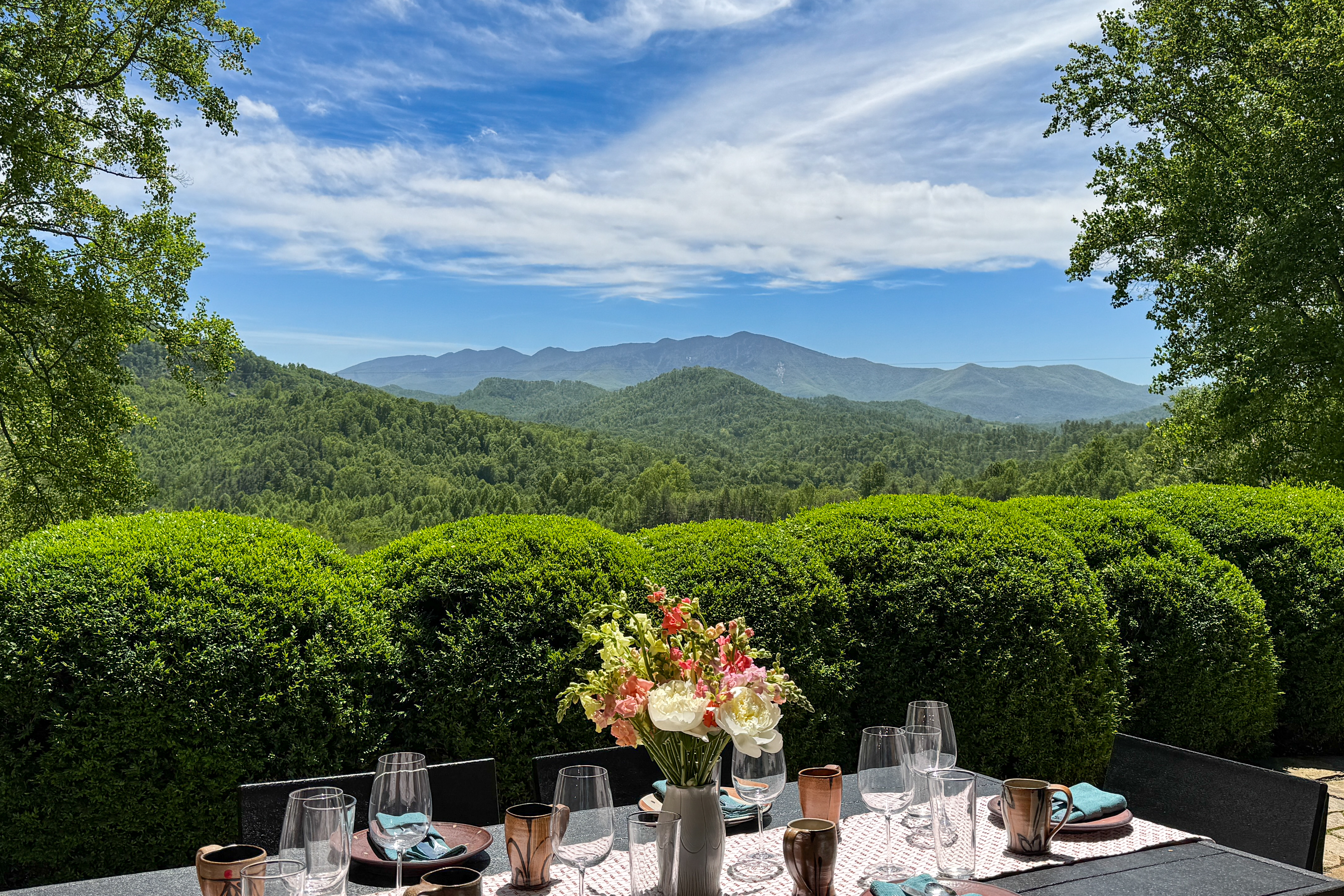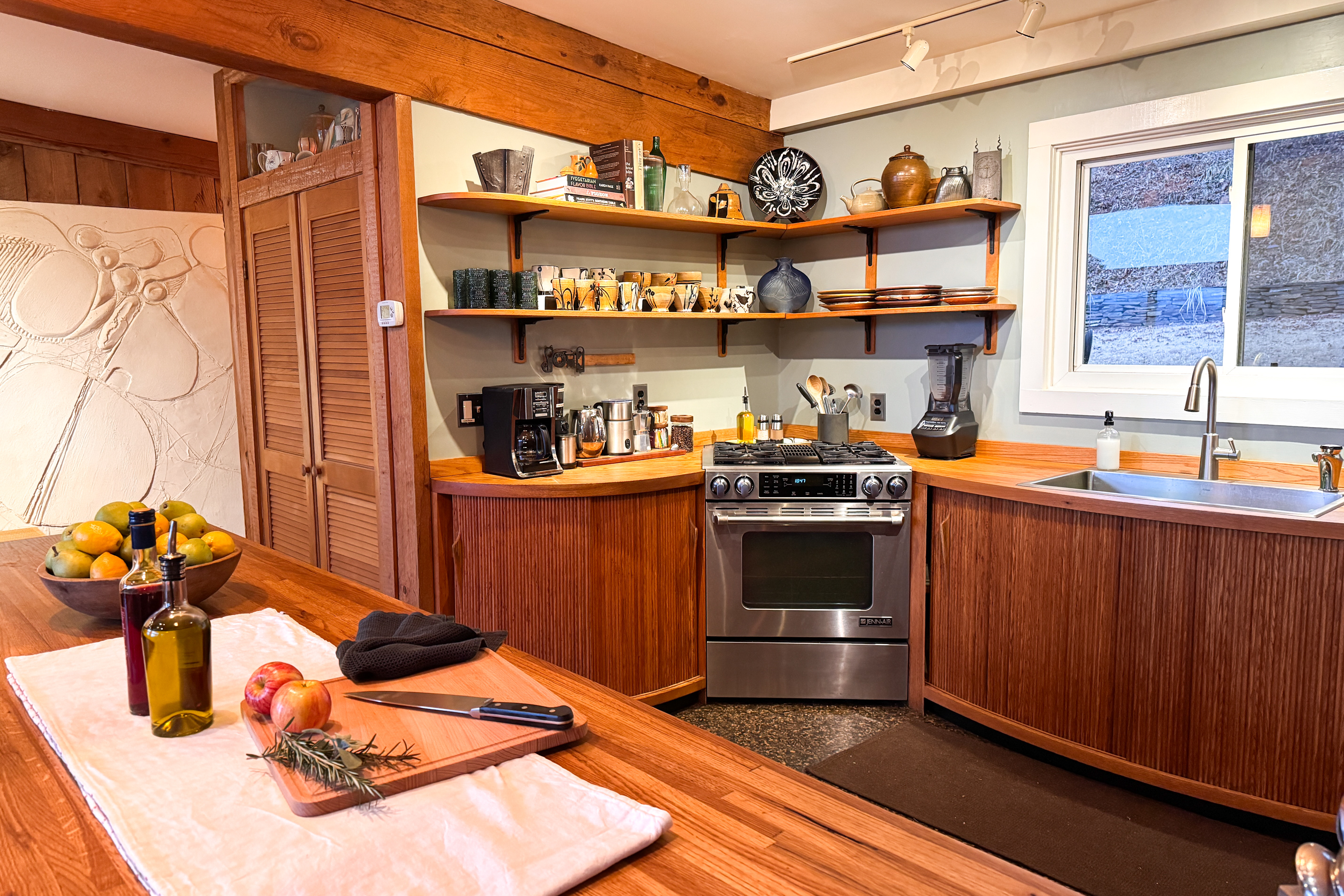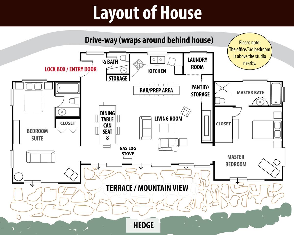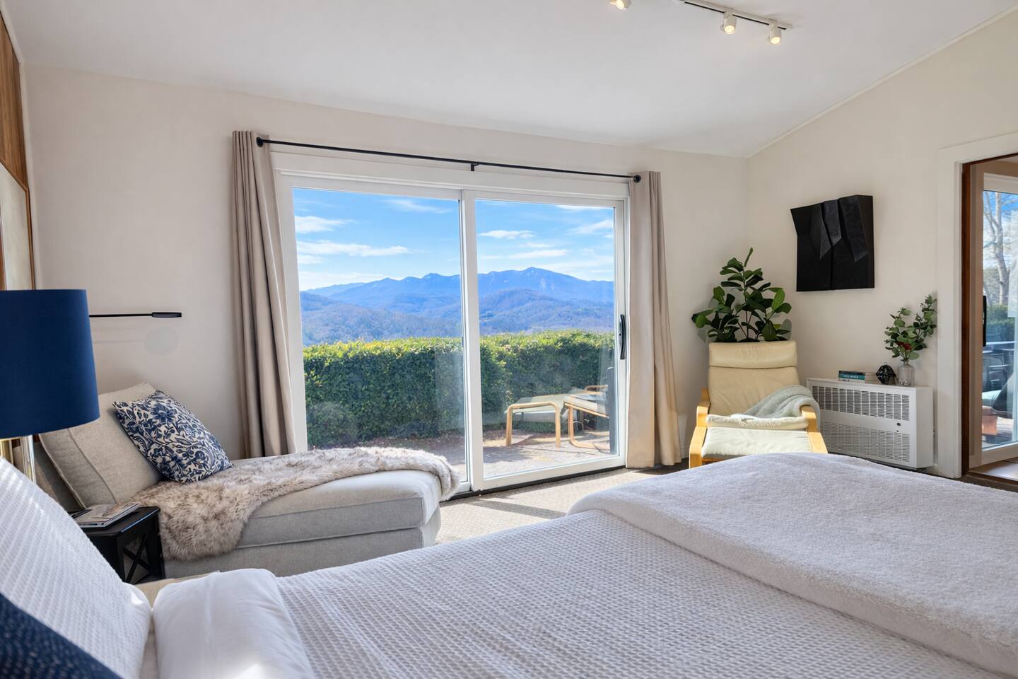 Explore, Create, Relax Hike the trails, visit waterfalls, bake bread in the chef’s kitchen, paint the stunning view, photograph a mountain sunset, take a class at Penland, enjoy a writers’ retreat, soak in the jetted tub while watching a movie, or simply catch up on your reading—this modern glass house is perfect for all of it. (Some trails remain closed from Helene, but many are now open.) *💛 Please click the heart in the top right corner to add us to your wishlist! Doing this helps you find the home later and helps great guests like you find us too. We’ve loved hosting since 2015 and pride ourselves on an excellent stay. Read on for more reasons to visit this year. ⸻ AMENITIES Beds: 2 Kings (per primary), 1 Full Foldout (2nd Primary), 1 Queen (detached office) Total Living Space (with office): ~2,450 sq. ft. General • Safe, rural location 15 minutes from town • 6 private acres at 3,200–3,400 ft. elevation with panoramic mountain views • Fast fiber-optic internet & mesh Wi-Fi • Smart home with Alexa & keyless entry • Motion-sensing exterior cameras • Handmade details & commissioned artwork throughout • Easy access from state-maintained roads Family Friendly • Toddler tableware, Pack ’n Play with sheets • 1,150 sq. ft. terrace with fenced yard & hammock • HE washer/dryer with detergent ⸻ LIVING & DINING (~1,000 sq. ft.) • Indoor seating: bar/prep 7, dining 8 • Outdoor dining for 10 on 1,152 sq. ft. stone terrace • Half bath • 65” 4K HDTV, sound bar • Mini Nintendo & Xbox One S (account required) • Amazon Fire streaming with house accounts • Cable & live sports via Amazon TV ⸻ KITCHEN • Coffee & tea setup: French press, Mr. Coffee w/reusable filter, moka pot, pour-over, hot water dispenser, burr grinder, milk frother, and medium roast Fair-Trade beans and an assortment of teas • Gas range, convection oven, Sub-Zero fridge, stainless dishwasher, microwave • KitchenAid Pro mixer, Ninja blender & food processor • Cuisinart cookware & utensils • Handmade Fork Mountain pottery tableware • Pantry staples & cleaning supplies • 30+ sq. ft. of prep space—cook and socialize • Weber charcoal grill (charcoal not provided) • Seasonal apples, pears, blueberries, and fresh herbs on property ⸻ PRIMARY SUITE (~500 sq. ft.) • King bed, HDTV, chaise lounge reading nook, walk-in closet • Ensuite bath: jetted tub, separate shower, heated floors, custom fixtures • Hairdryer, toiletries, makeup mirror, plush towels • Independent heat & A/C SECOND PRIMARY (~500 sq. ft.) • King bed, queen foldout couch, HDTV, closet & dresser • Ensuite bath: tub/shower combo, makeup mirror, hairdryer, toiletries • Separate water heater & independent climate control DETACHED OFFICE/3rd BEDROOM is available upon request. As us for details. An additional $30 cleaning charge will apply. ⸻ ABOUT THE HOME Originally two cabins joined by artist and former Penland director Bill Brown Sr., the home now features two suites and an open, light-filled living area. Many original railings and details remain, including a Doug Sigler-designed kitchen. Its passive-solar design captures warmth and sunlight year-round, framing mountain views from every room. The home features commissioned artwork and handmade pieces that reflect the area’s craft heritage. ⸻ VISITING IN THE OFF-SEASON: Winter views are breathtaking! Trails and waterfalls are quiet and serene. Some businesses adjust hours mid-December through February, but others offer pop-ups, events, and winter menus. If you’d like help deciding whether the off-season fits your plans, just ask—we’re happy to help. ⸻ CHILDREN: Children are welcome! This is a home, not a museum, but we ask parents to be attentive—move delicate items or cords out of reach as needed for safety. ⸻ ✅ Have a larger group? Our sister property, Dougs Way, sleeps 10 and is just 4 minutes away. Ask for details!
