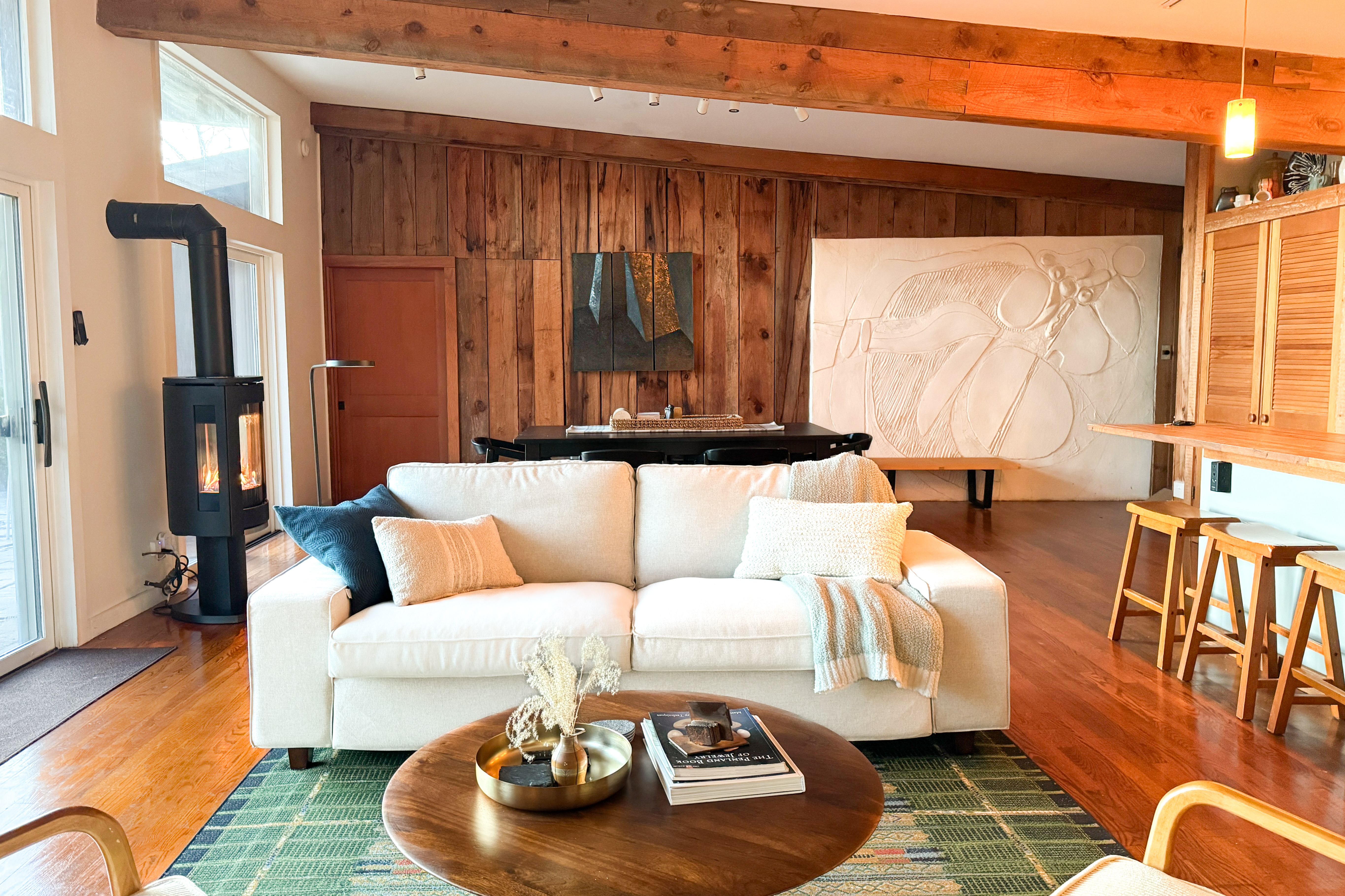 Located off state maintained roads just 15 minutes from shopping & exploring in Spruce Pine, Burnsville, and Bakersville, and just 48 miles from Asheville, Conley House is a modern mountain gem with lots to do! _____ ABOUT THE CABIN + Conley House was originally 2 cabins with a courtyard in between. The owner, Bill Brown Sr., later turn the cabins into 2 suites with an open floor plan living space between for him and his family. Bill Brown was director of Penland School after Lucy Morgan, the founder, retired. Railings and many other details are original to the home. The kitchen was made by well known woodworker, Doug Sigler. The cabin is filled with natural light in every room with each door framing the view. The home was designed to be passive solar, so it is not uncommon to be able to leave the doors open on warmer days in February. The abundance of light makes the home a cheery place that is very relaxing. We have filled the house with commissioned and original artwork that we have collected over the years. We hope it inspires you! _____ VISITING IN THE OFF-SEASON + Views in winter are amazing! Hiking the Roan or to waterfalls can be spectacular with almost no one else on the trail. However, in winter (usually mid-December through February or mid-March) some businesses keep different hours or even close, while others do creative things like popup restaurants and special winter openings. If you are concerned about what might be available please ask us. We'd be happy to assist you in deciding if visiting in the off-season would be a good fit. _____ CHILDREN: Children are welcome. The house is a home not a museum, so it can be a great place for families. We ask that parents be attentive, putting objects out of reach that may cause a problem or be damaged, putting delicate items are cords out of reach. A number of kid-friendly items such as a cutlery and plates, sippy cups, pack and play, highchair, etc. are available in the cabin. _____ Conley House is an exceptional experience. We book in advance but please check with us. We’d love to have you! Prior to your stay, we require you to complete a pre-arrival form and sign & agree to our rental conditions.